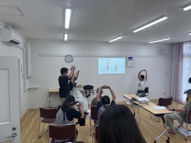よかトレでは、ウエルケア訪問看護ステーションの理学療法士が参加者にアドバイスをしながら、